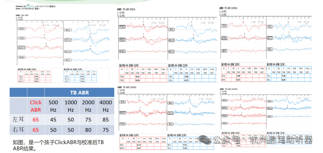 所谓阈值,是指能分化出V波的最低刺激强度,我们也常常以此来判断听力损失程度。在《婴幼儿听力损失诊断与干预指南》中指出,ABRV波反应阈值≤35dBnHL为听力正常范围。在《人工耳蜗植入工作指南(2013版)》中指出ABR大于90dBnHL即达到了人工耳蜗的植入标准。在ABR测试中,按照给声途径不同分为气导ABR与骨导ABR,结合气、骨导阈值可以判断听力损失的性质为感音神经性听损、混合性听损还是传导性听损;按照信号声不同还可以进行短声ABR,短纯音ABR等测试,其中短纯音因具有频率特异性,其ABR阈值也可以判断各个频率的听力损失程度。