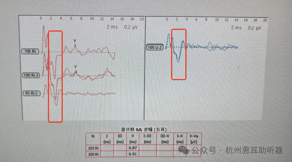 ABR潜伏期变化除了上文中提到的听力损失性质,还有一些特殊的情况,如听神经瘤:一侧潜伏期正常,一侧潜伏期延长,双耳Ⅴ波潜伏期相差>0.4ms,这一变化是由于肿瘤压迫听神经,导致神经传导时间延长,是ABR检查中诊断听神经瘤的重要依据之一。若发现此类异常,需结合其他检查(如MRI)进一步明确诊断。