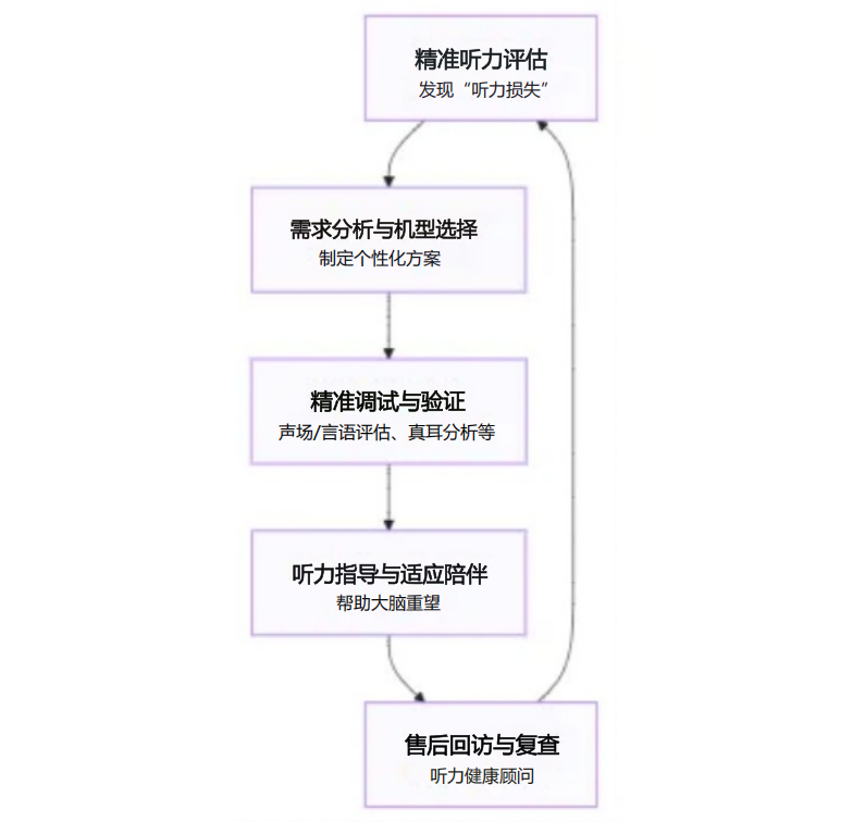 下面这张图清楚地展示了专业验配师是怎么通过一套完整的流程,最终为您实现清晰的聆听体验: