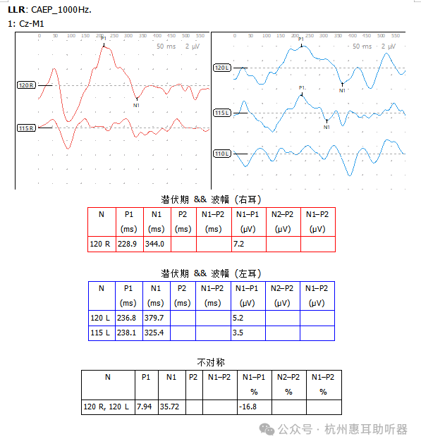 受到大伯不会普通话,听力程度重等影响,PB max等主观言语测试无法进行,因此在进行耳蜗术前常规ABR、ASSR检查外,还进行了言语分辨能力评估的客观检查——CAEP。