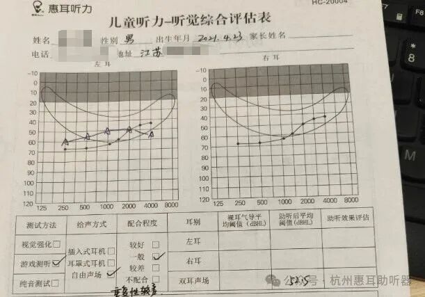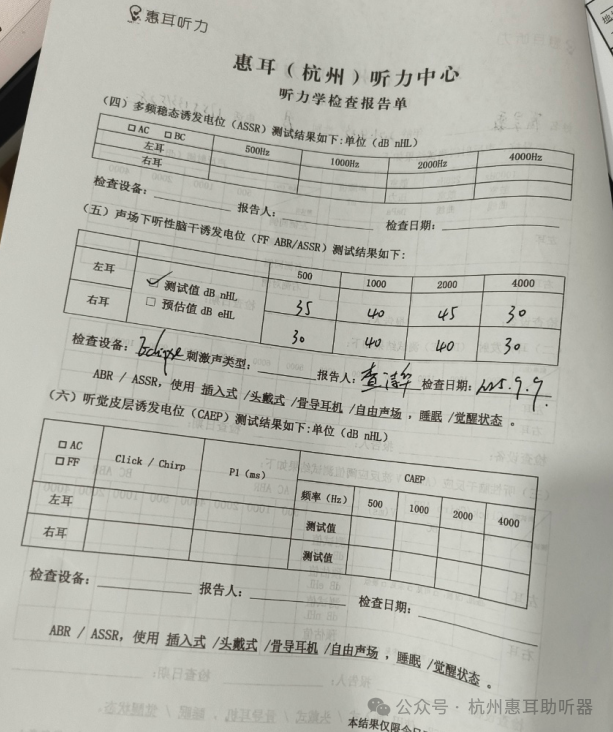 妈妈这才知道孩子一直不说话的原因,非常后悔,当天就选择佩戴助听器给孩子进行听力干预。佩戴后进行游戏测听评估,考虑到孩子第一次进行检查,配合度不高,再次进行FF-ABR检查。