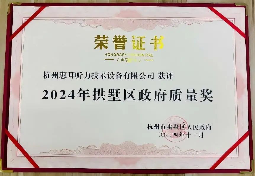 喜报!在2024年度区级权威奖项评选中,杭州惠耳听力技术设备有限公司凭借在"卓越绩效管理模式"框架下所展现出的卓越综合管理效能与显著实践成果,成功斩获"拱墅区政府质量奖"这一殊荣。该奖项不仅是对我司整体经营管理水平和全面质量提升成果的高度认可,更标志着企业质量管理体系已达到行业标杆!