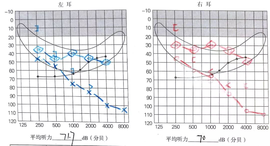 2、纯音测听:双耳下坡型听力损失,平均听力,左耳71.7分贝;右耳70分贝。